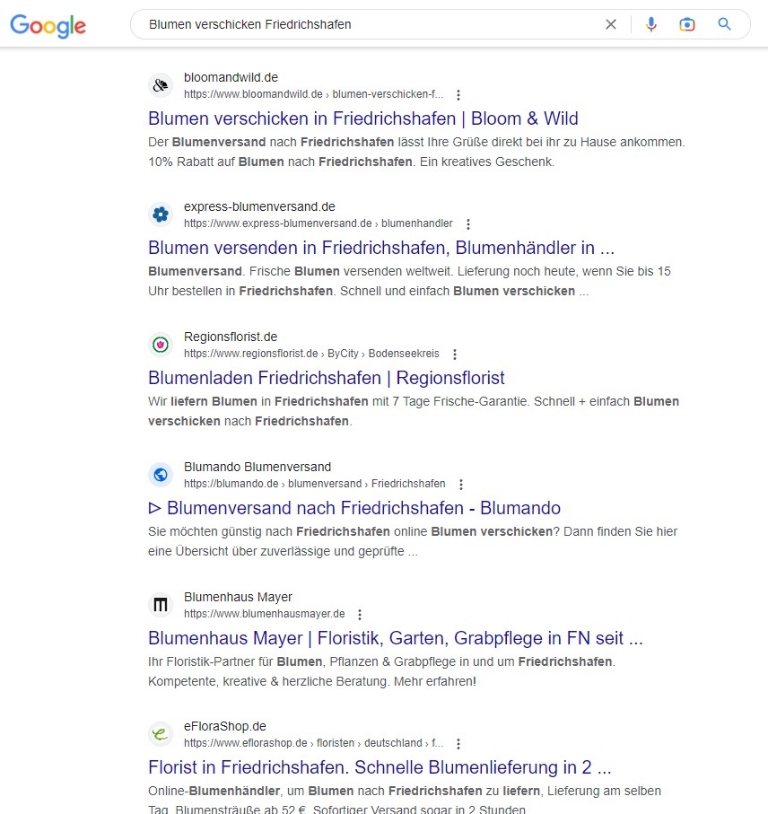 Wie können Sie Ihre Webseite auf die Anzeige in den Suchergebnissen in Ihrer Region optimieren? Das Wichtigste ist, so zu denken, wie Ihre Kunden denken. Nehmen wir an, ein Kunde möchte bei einem Floristen oder einer Gärtnerei Blumen für sein Büro in Friedrichshafen bestellen. Der Kunde sucht dann in der Regel nach “Blumen verschicken Friedrichshafen”. Das sind die Ergebnisse: