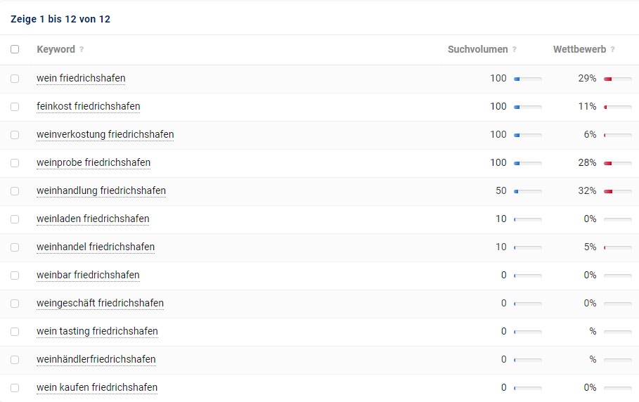 Jetzt wissen Sie es schwarz auf weiß: Optimieren sollten Sie auf “Weinhandlung Friedrichshafen”. Den Begriff “Weingeschäft” können Sie natürlich auch verwenden. Er wird aber viel weniger Besucher auf Ihre Webseite bringen.