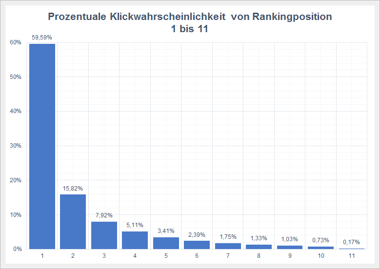 99,1 % aller organischen Klicks (also ohne gekaufte Anzeigen) erfolgen auf Position 1 bis 10. Für die restlichen Seiten bleiben nur noch 0,9 % der Klicks übrig. Das folgende Diagramm zeigt die Verteilung der Klicks auf den Positionen 1 bis 11.
